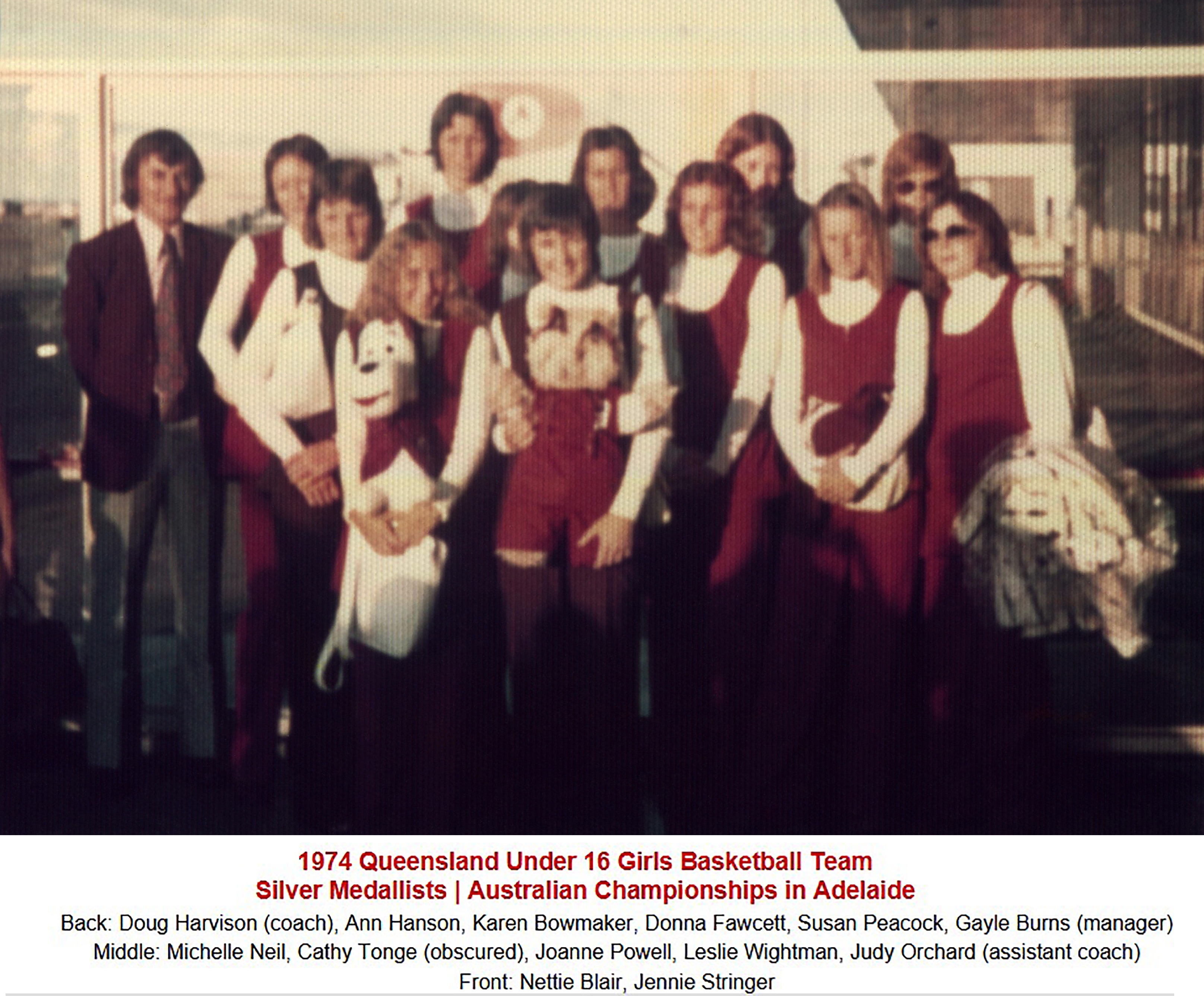 The 1976 Under 18 Girls basketball team competing in Toowoomba, showcasing Queensland’s young talent during state-level championships.